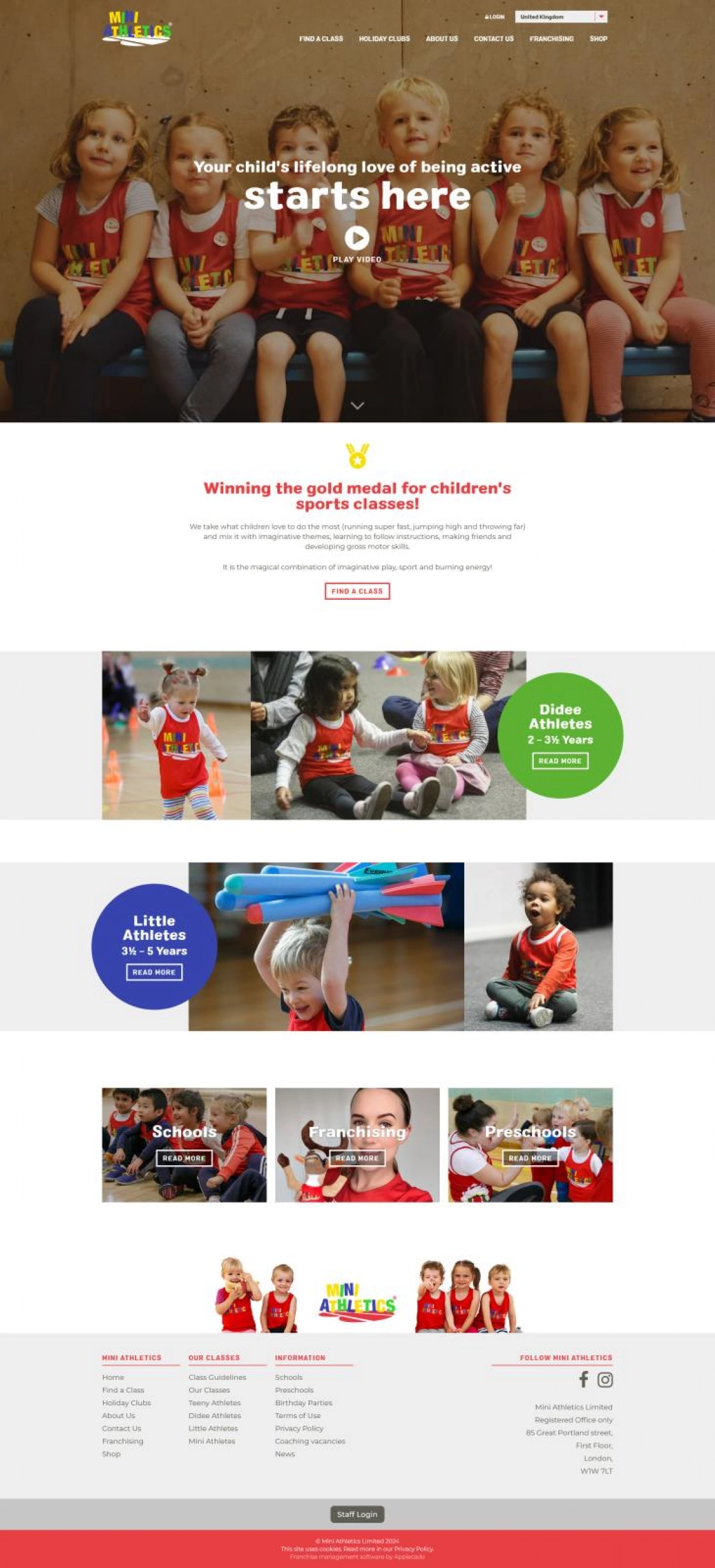 Early on, we were briefed by the Mini Athletics team enabling us to understand exactly what the team were looking for from the new site’s design, and of course what the franchise owners would need from their administration areas. We set about working on a fun, modern and responsive website. We really like the looping homepage video, which can be swapped with the full length video if you click to play.